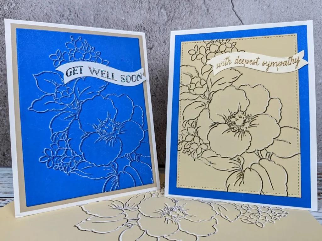 In my recent YouTube video, I demonstrate a fun and easy way to create an embossed look to your cards without using an embossing folder!  Select a big, bold stamp (florals work great), cardstock of your choice of color, and an ink (dye inks work great!) that is the same or close to the color of your cardstock, but one shade darker. Watch the video below to see how to “offset” the cardstock after the initial stamping. Then restamp the same image using white pigment ink. The effect is stunning, and it will look as if the image is jumping off the page.