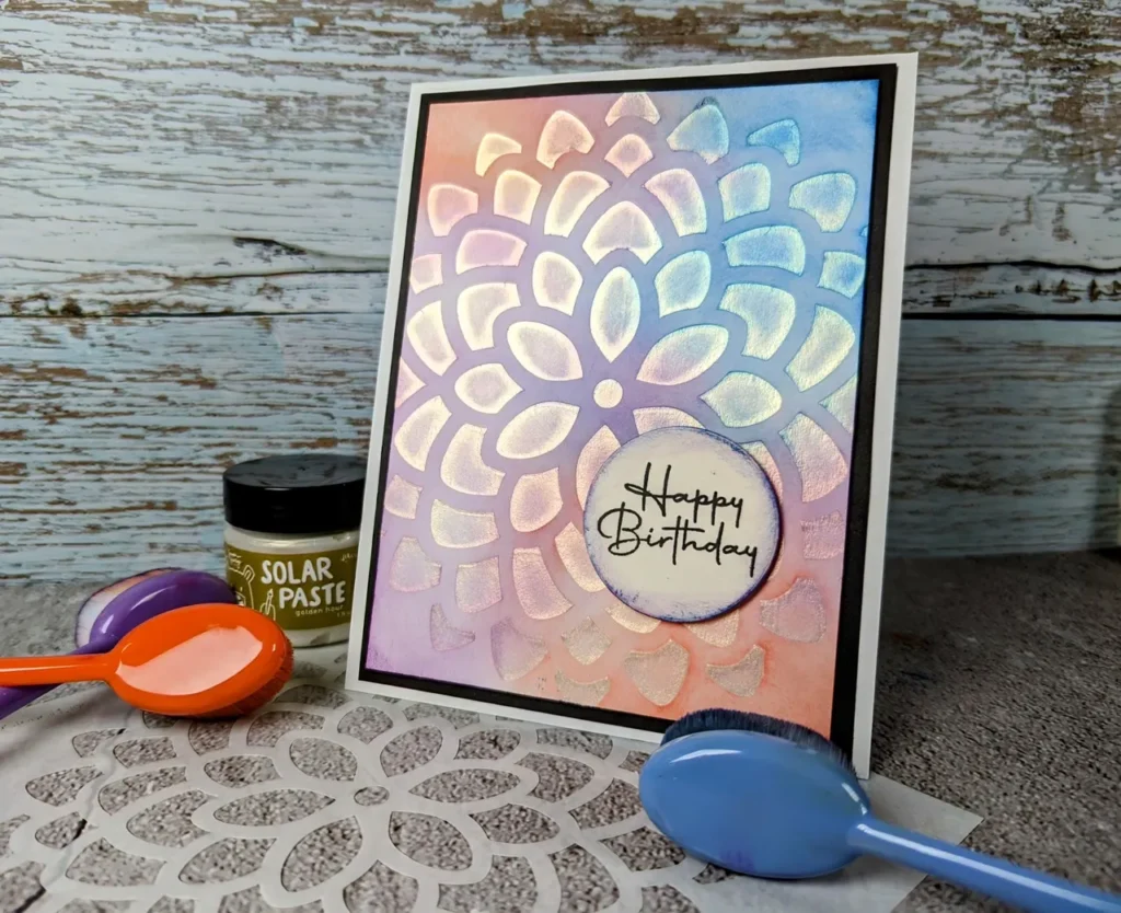 Another fun birthday card using Simon Hurley’s Solar Paste as the focal point. This product is super easy to use and will add a stunning, shimmering element to your card project. Video tutorial is below. Give it a try!